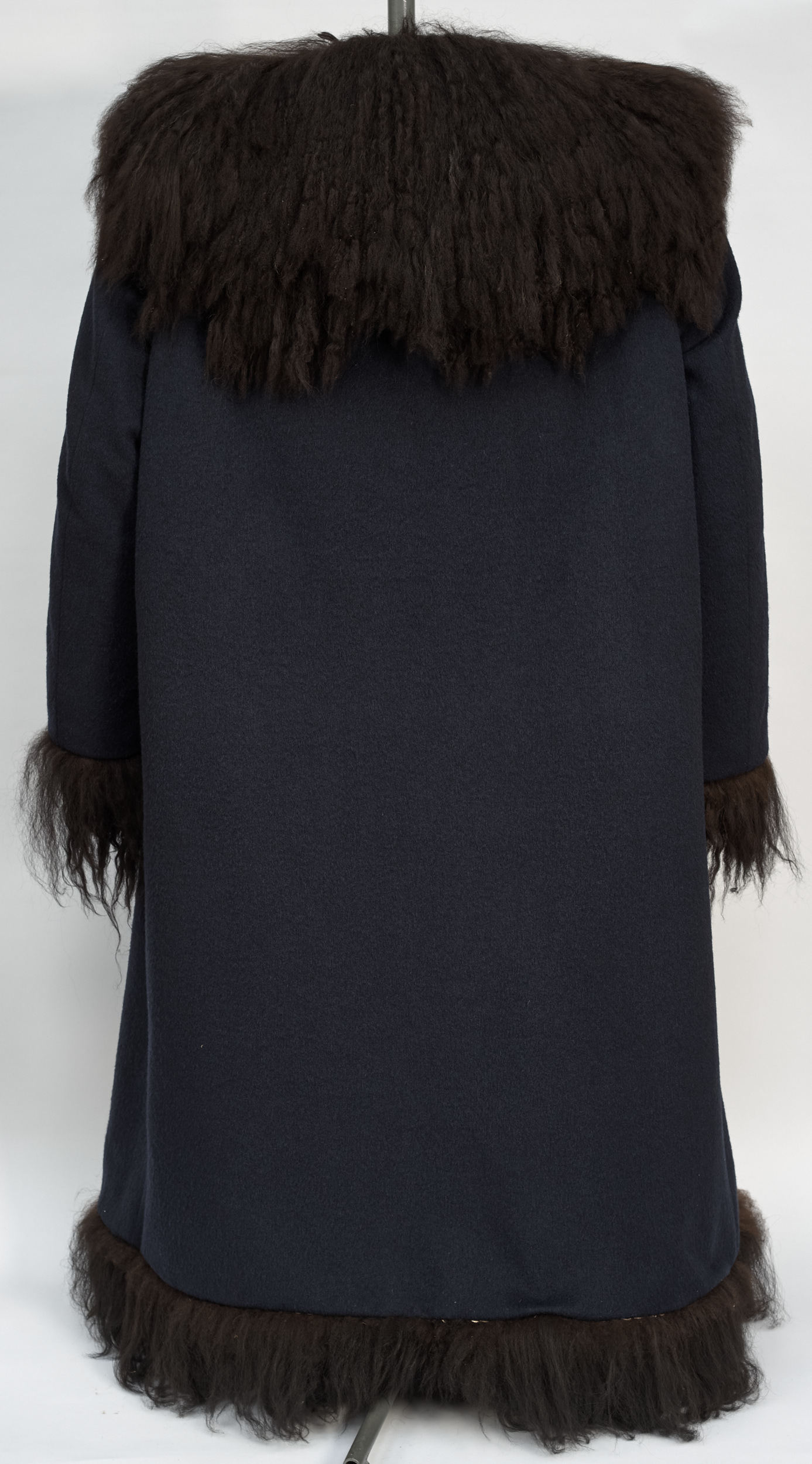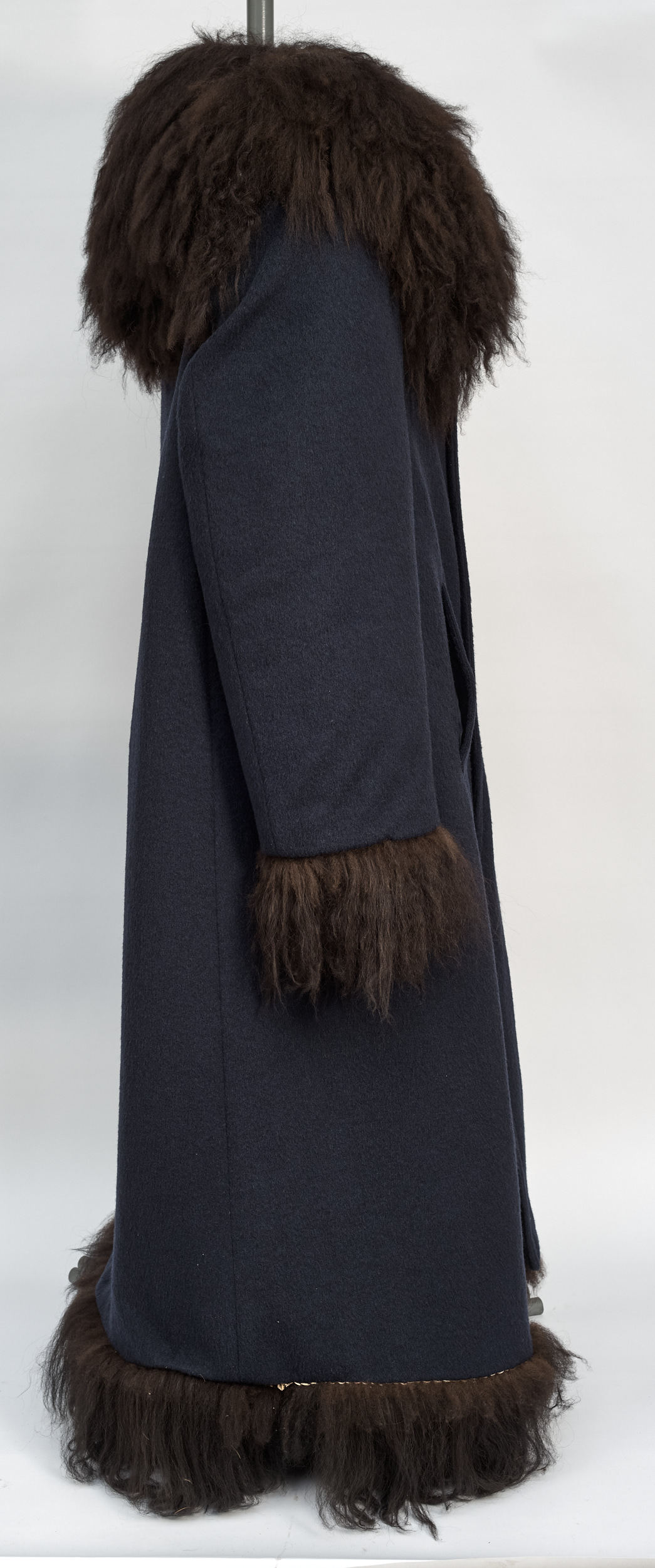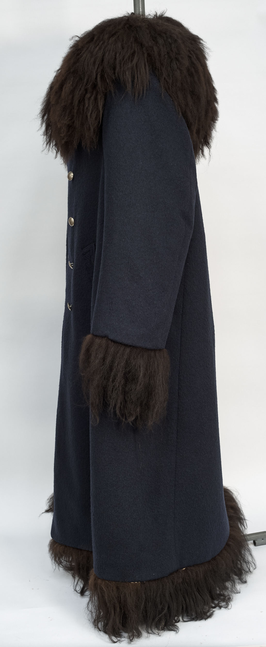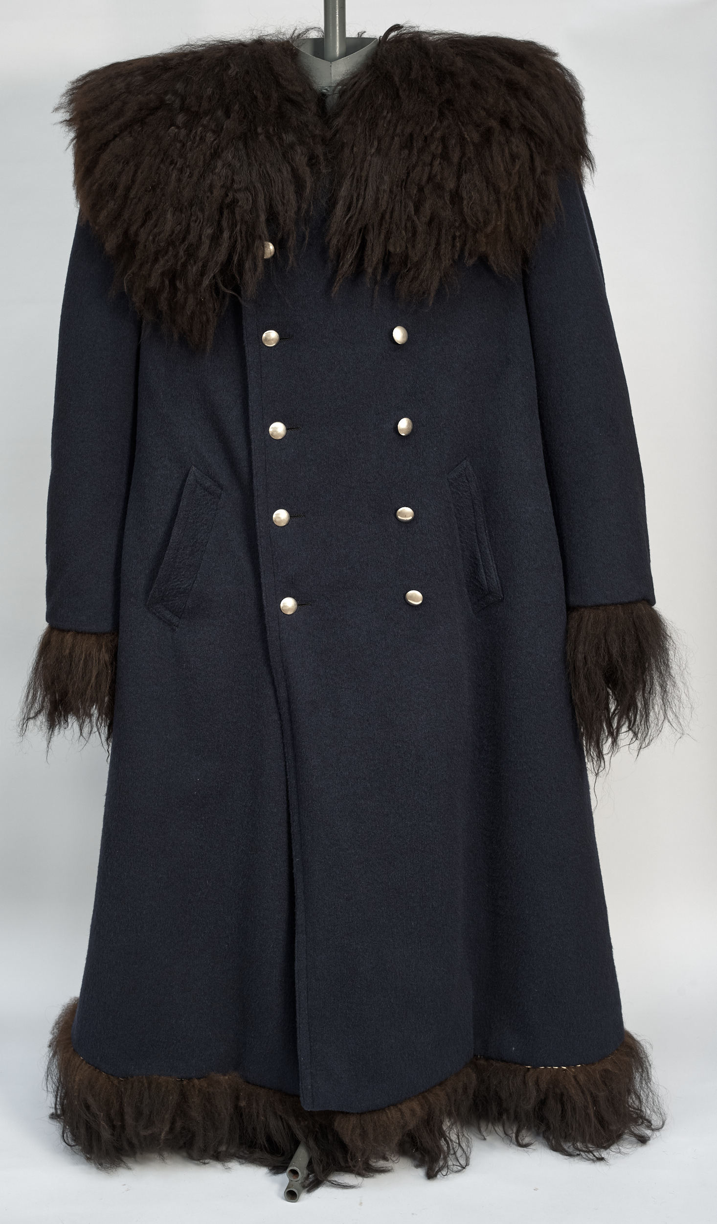 Zimowy płaszcz liberyjny z granatowego sukna na baranim błamie. Luźny, z przodu dwurzędowy, zapinany na dziesięć guzików, po bokach z kieszeniami. Rękawy luźne, długie. Kołnierz z szerokim, zasłaniającym ramiona kołnierzem z czarnego futra owczego z długim runem, takim samym futrem obszyte brzegi mankietów i dolny brzeg płaszcza.
