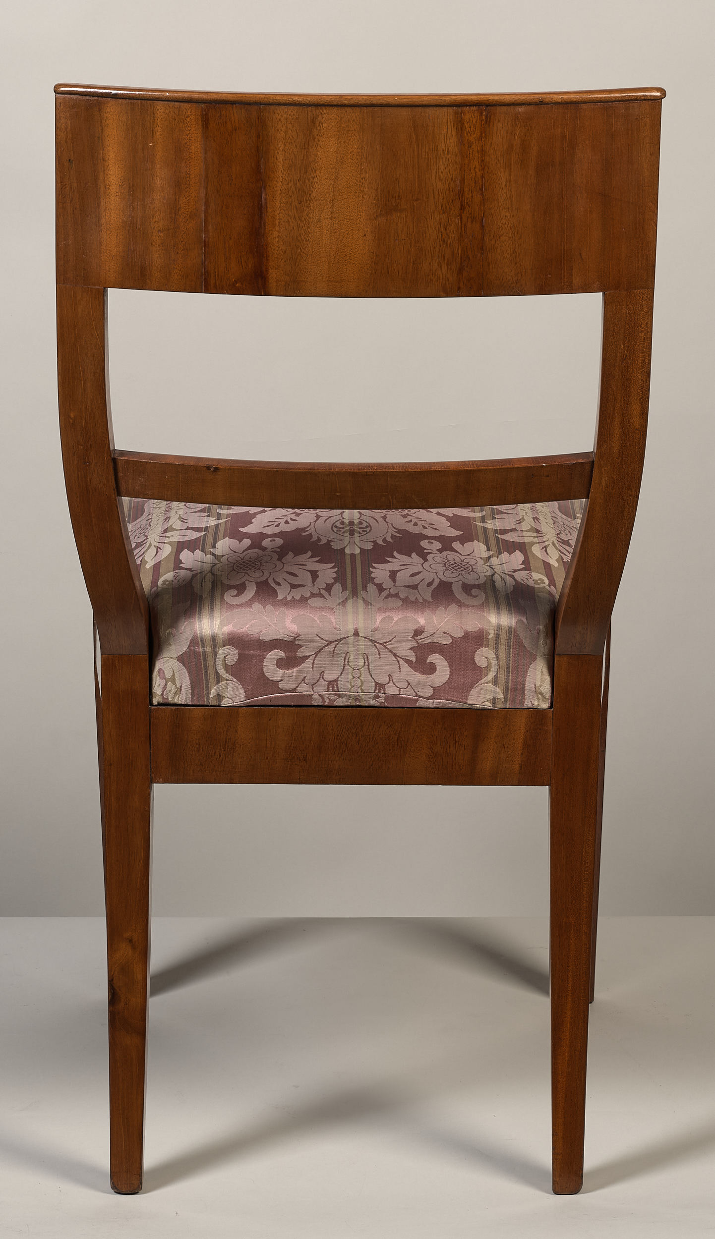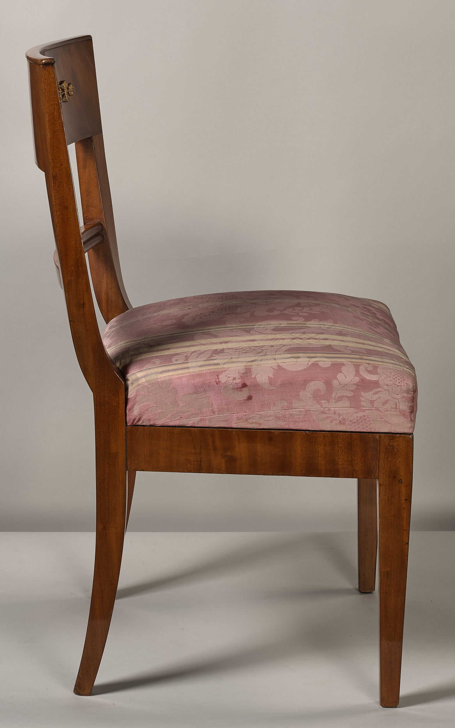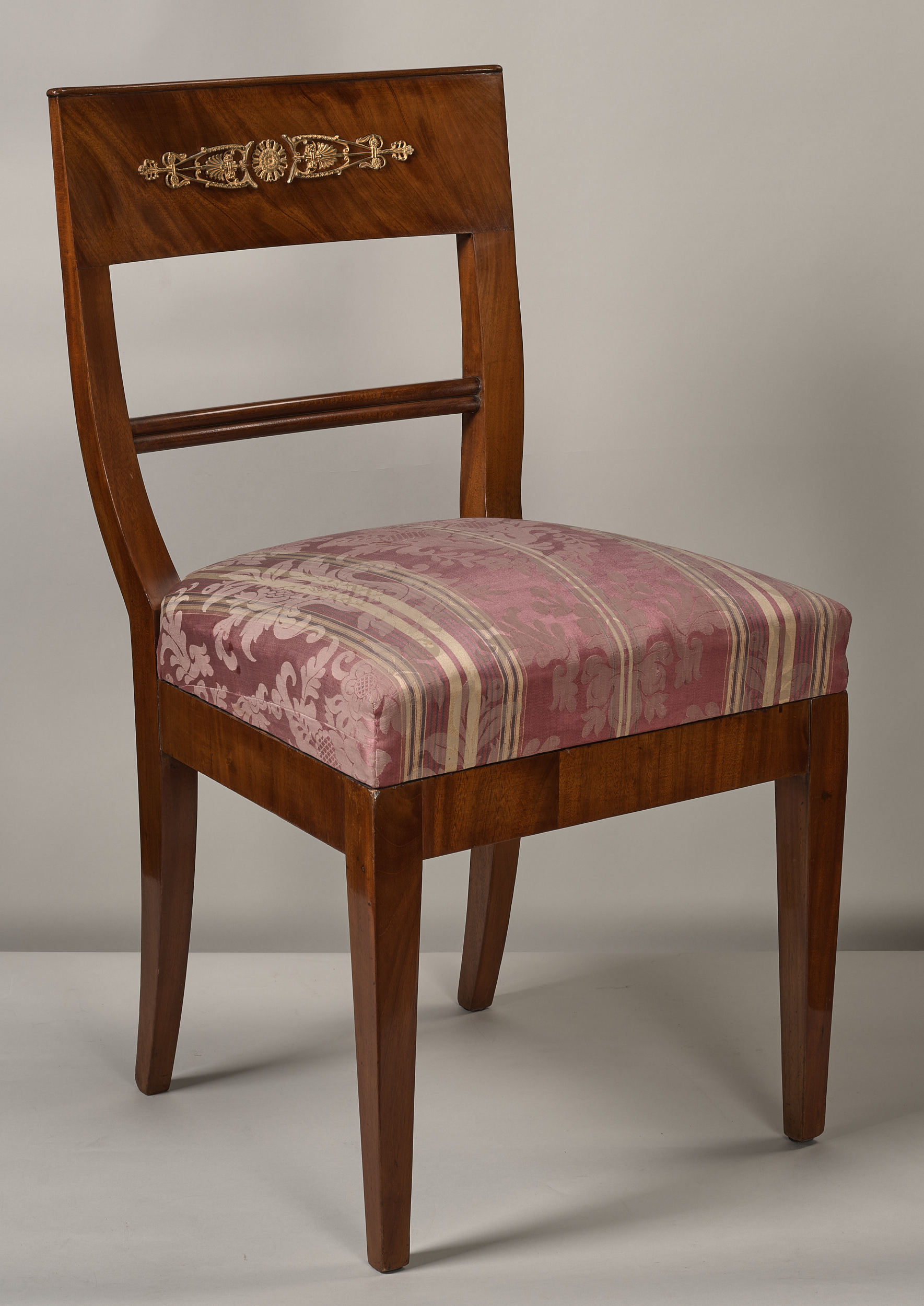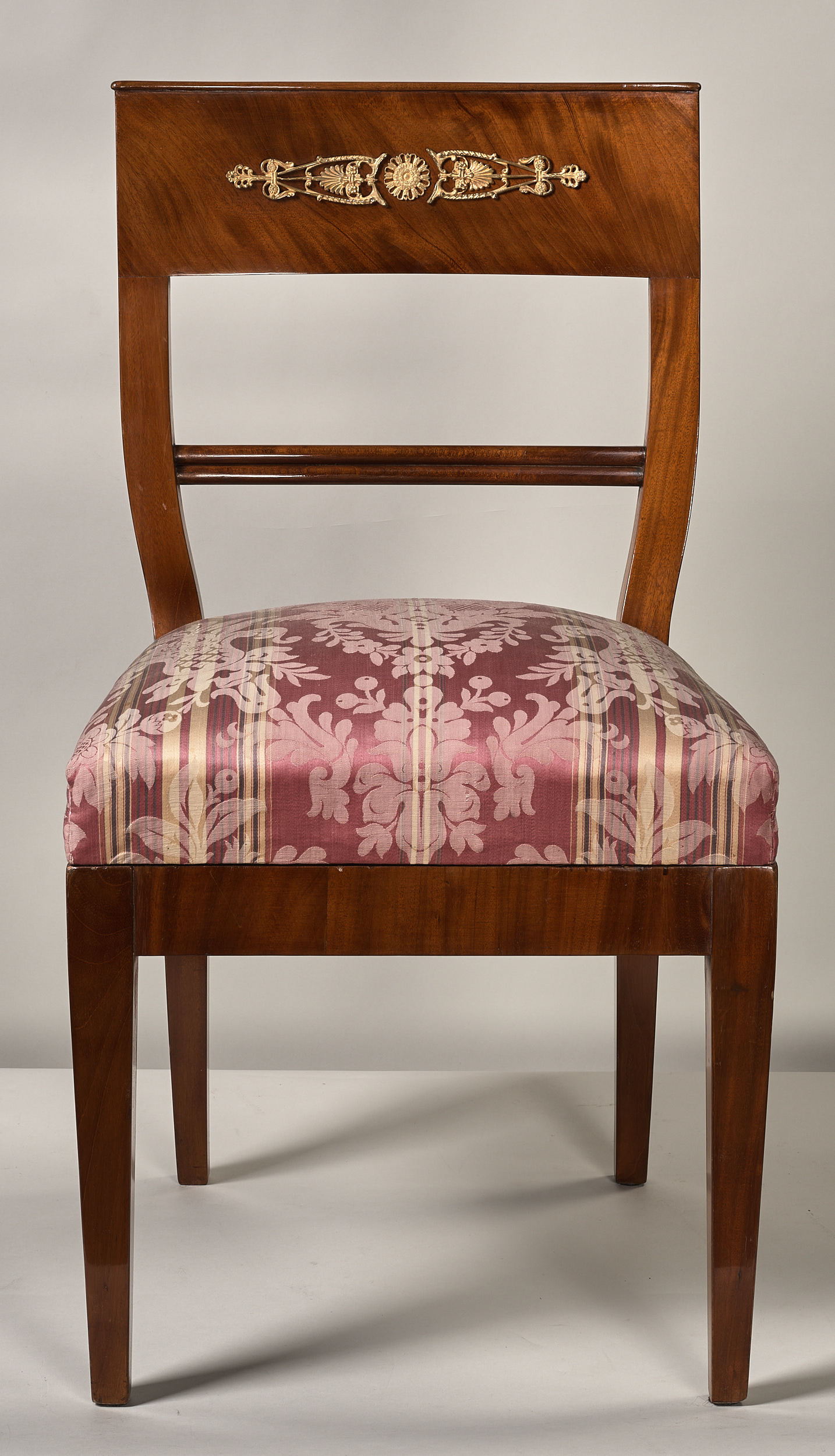 Po zakończeniu rewolucji francuskiej i upadku dyrektoriatu, programowo deklarującego prostotę w urządzaniu wnętrz, na początku XIX w. sztukę zdominował nowy styl. Pojawił się z przyjściem do władzy Napoleona Bonaparte, nazywany był stylem cesarstwa – po francusku „empire”. Nowa moda wyrażała osobiste upodobania Napoleona I zainspirowanego potęgą starożytnych cywilizacji – greckiej, rzymskiej i egipskiej. Empire stał się propagandowym narzędziem gloryfikacji Cesarstwa Francuskiego i jego władcy. Rozpowszechniony w Europie, styl rozwijał się na terenie Polski, zapatrzonej w zwycięstwa militarne Napoleona, wzbudzającego nadzieje na odzyskanie utraconej niepodległości kraju. W urządzaniu wnętrz styl cesarstwa wyróżniały zapożyczenia antycznych wzorców greckich i rzymskich. Tam, gdzie brakowało przykładów starożytnych, tworzono pseudo antyczne dzieła. Szczególnie dobrze widać to w meblarstwie. Moda empirowa narzucała ścisłą symetrię, gładkie płaszczyzny i wyraziste linie. Początkowo meble wykonywano głównie z mahoniu lub używano mahoniu w postaci cienkiej okleiny – forniru, którym pokrywano konstrukcje wykonane z innych gatunków drewna. Do starożytnych epok nawiązywały odlewane ze złoconego brązu ozdoby. Na prezentowanym krześle, pochodzącym wraz z pięcioma innymi i kanapą z kompletu S.7788MŁ; S.7825 – 7830MŁ, są to rozety i ażurowe palmety eksponowane na oparciu. Odczucie majestatu, dostojeństwa, stabilności i elegancji w kształtach empirowych sprzętów współgrały z wygodą użytkowania. Meble przeznaczone do siedzenia wytwarzano w bogatym asortymencie wyposażając je w tapicerowane siedziska. Wychylenie bądź ugięcie oparcia krzeseł zapewniały komfort podczas długotrwałego siedzenia.