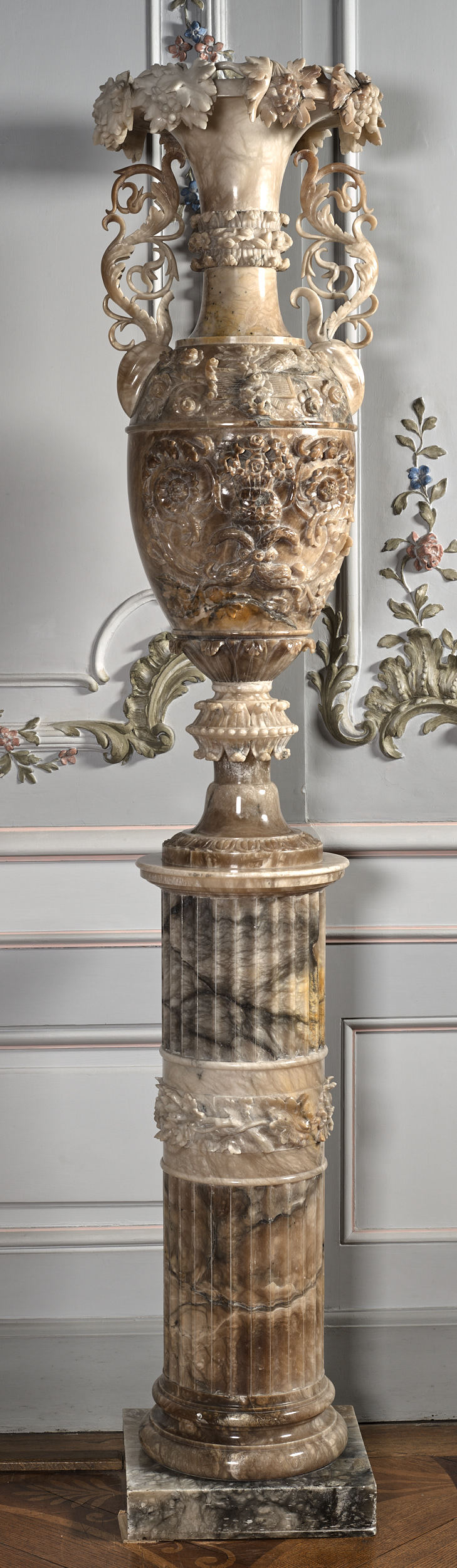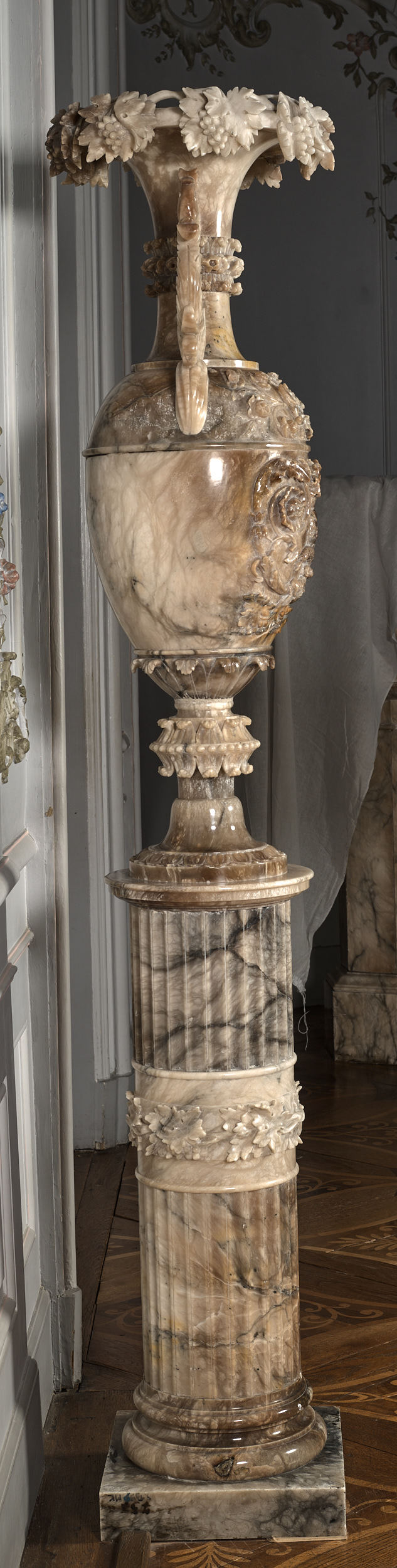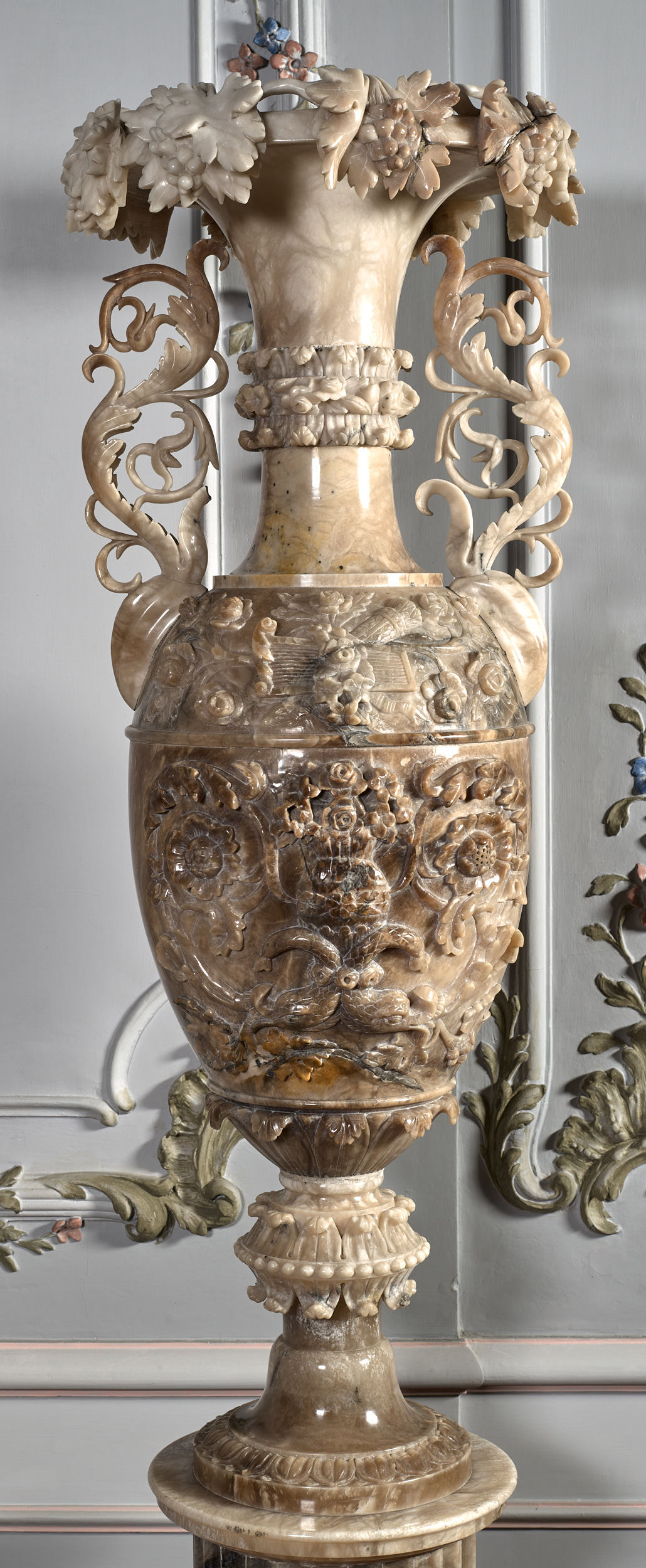 Wazon bogato rzeźbiony motywami roślinnymi