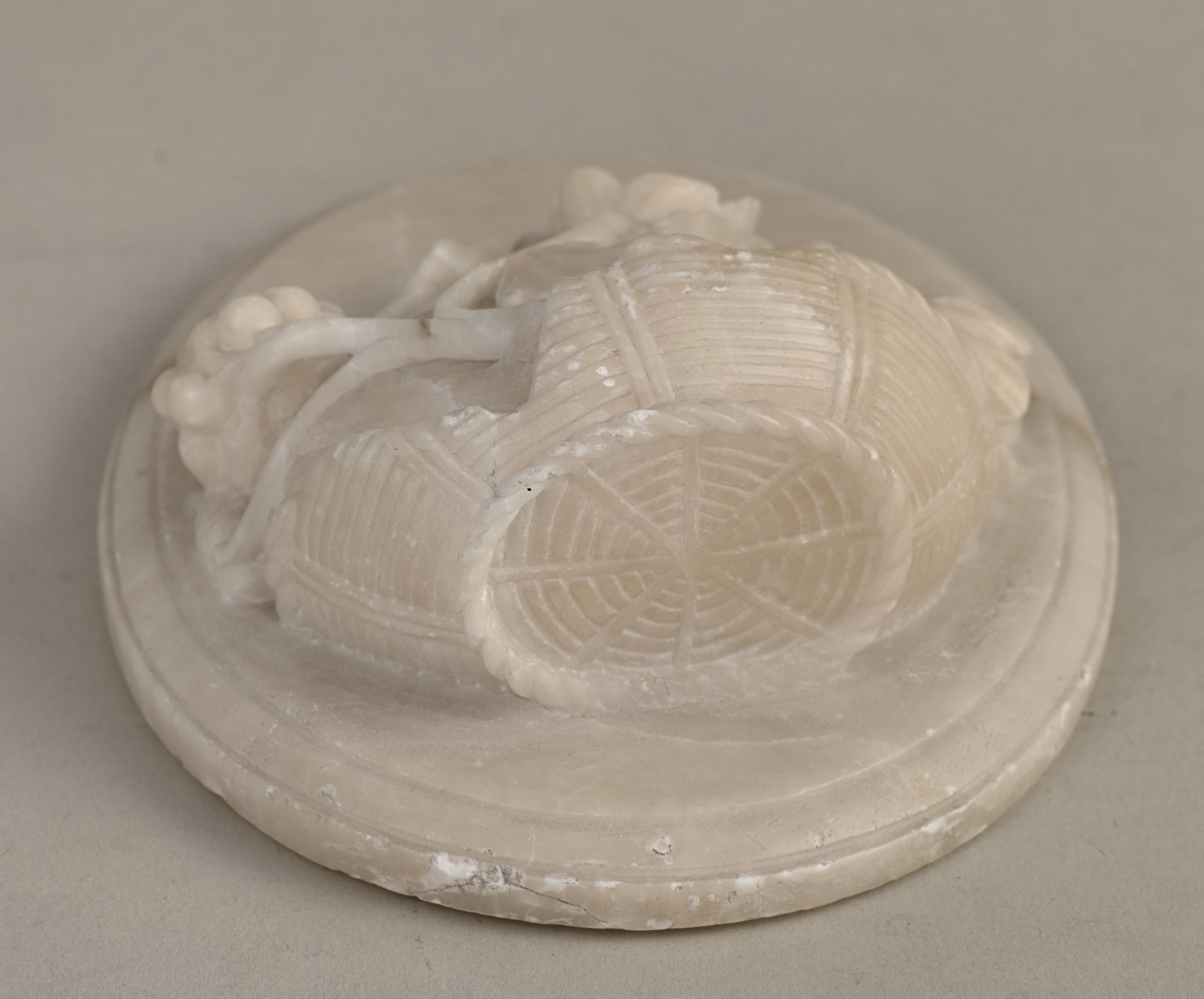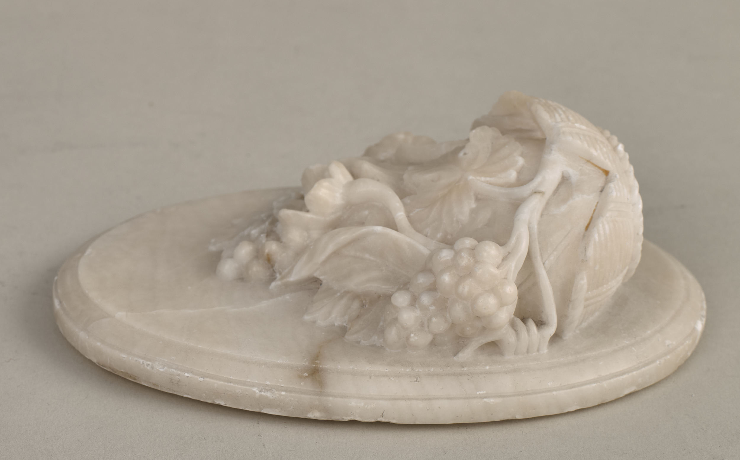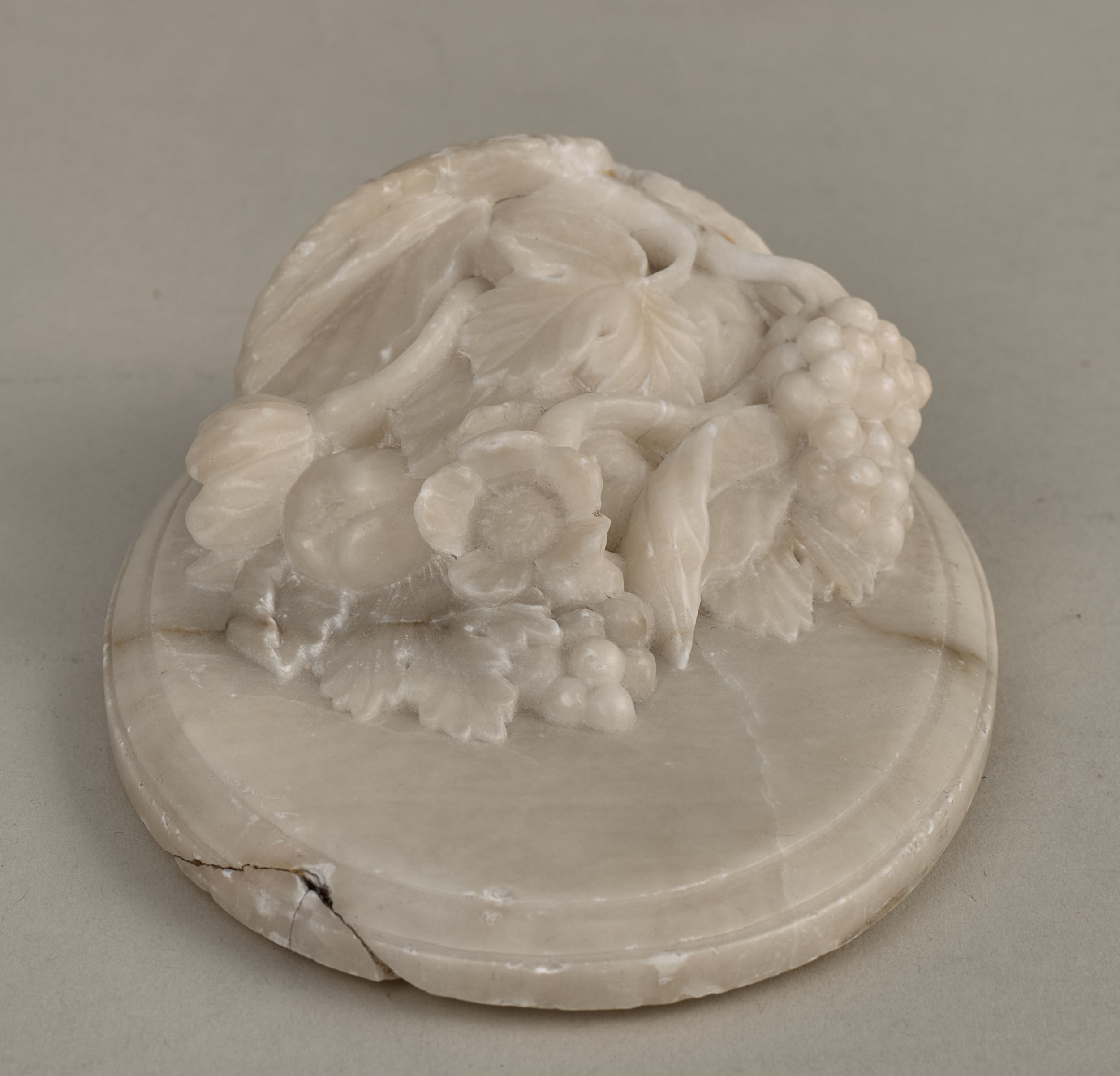 Przycisk do papieru. Alabastrowy przycisk do papieru ma kształt owalnego medalionu. Ozdobiony jest półplastyczną kompozycją z kwiatów, gałązek winorośli i owoców umieszczonych w koszu. Przycisk wykonany został przez nieznanego rzeźbiarza we Włoszech. Należy go datować przed rokiem 1787. Przywieziony został z Włoch przez księżnę Izabelę Lubomirską (1736 – 1816) do jej warszawskiego pałacu. Wraz z trzema innymi podobnymi przyciskami ujęty jest w spisie alabastrowych przedmiotów przywiezionych z zagranicy w maju 1787 r. do warszawskiego pałacu Lubomirskiej (zob. B. Majewska - Maszkowska, Mecenat artystyczny Izabelli z Czartoryskich Lubomirskiej (1736-1816), Wrocław 1976, s. 354).